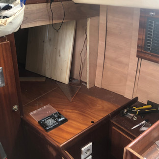 Auch verkleinerten wir unseren Kartentisch, was viel mehr Platz in diesem gedrungenen Bereich schaffte und vor allem die Hundekoje zugänglicher machte. Denn unsere Hundekoje ist der Ort, an dem wir unser ganzes Kite-Equipment verstauen. Jedes Mal war es uns ein Grauen, dort unser Zeug herauskamen zu müssen. Im Zuge dieser Umbaumaßnahme demontierten wir auch die alte Holzverkleidung der Wände, da sich dort immer Feuchtigkeit angesammelt hatte. Das ist nicht nur für unsere Kites auf Dauer ein Todesurteil. Wir isolierten die gesamte Koje und verkleideten sie mit neuem, feinsten Mahagoni-Sperrholz. Den alten Kartentische tauschten wir gegen eine kleinere selbstgebaute Version.